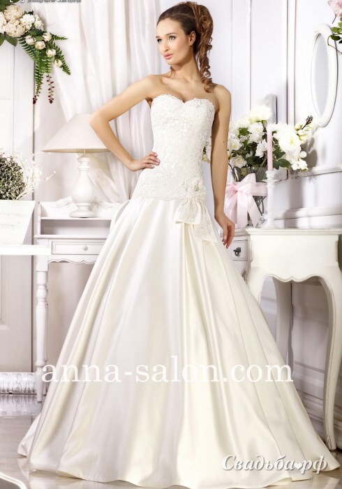 Романтичный свадебный наряд с открытой зоной декольте и заниженным корсетом из кружева. Длинная юбка из благородного атласа расширяется к полу. На границы юбочки и корсета расположился кокетливый бант. Наряд отличается лаконичностью декора. Свадебный салон Anna Dress, www.anna-salon.com, тел.: 8-926-975-62-09