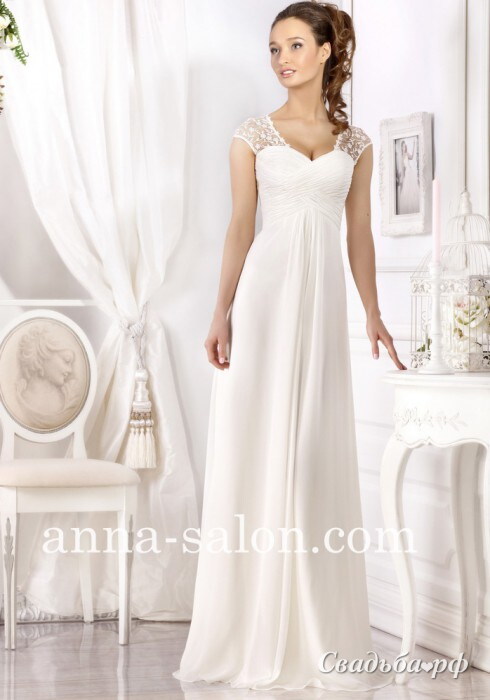 Шифоновое свадебное платье с открытой зоной декольте выполнено в стиле Ампир. Широкие бретели из полупрозрачного кружева придают образу романтичность. Длинная юбка с завышенной талией зрительно вытягивает силуэт и стройнит свою обладательницу. Свадебный салон Anna Dress, www.anna-salon.com, тел.: 8-926-975-62-09.