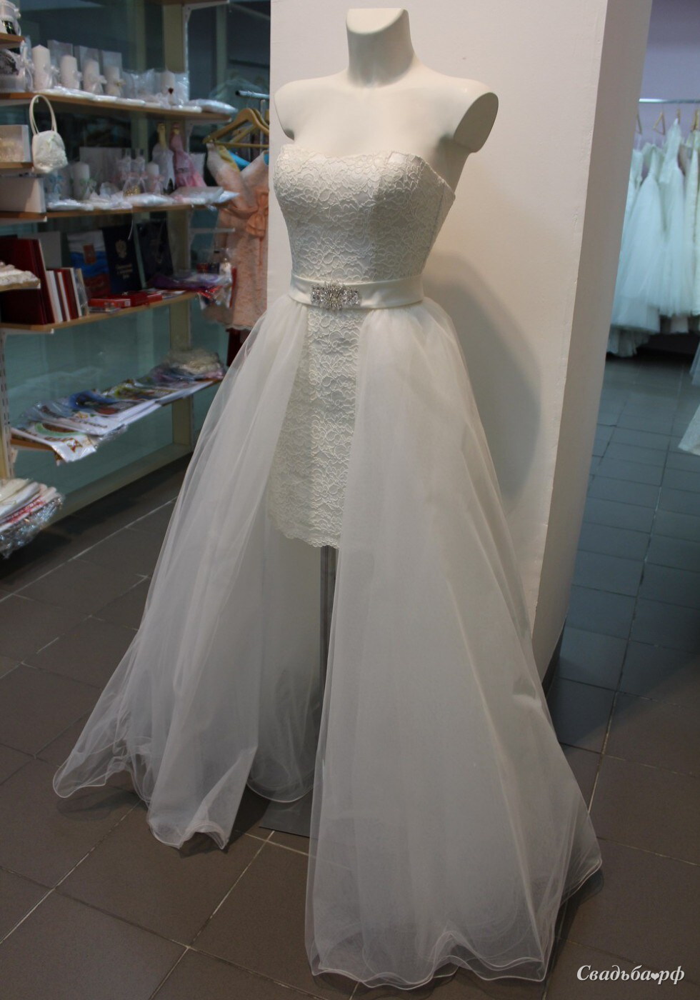 Оригинальное свадебное платье – трансформер поможет Вам продемонстрировать стройность Ваших ножек. Кружевной футляр с открытой зоной декольте и короткой юбочкой дополнен съёмным чехлом – юбкой из тончайшего фатина. Талия подчёркнута широким поясом со сверкающей вставкой. Заходите на наш сайт: www.anna-salon.com.