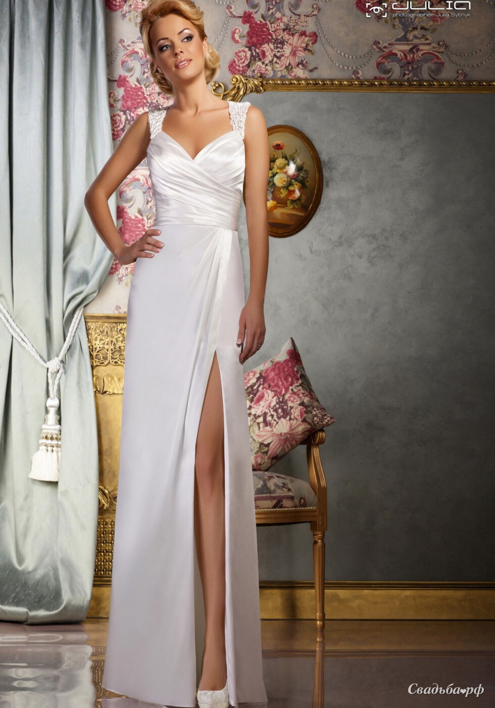 Свадебное платье из атласа с разрезом по ноге. Спинка декорировано кружевом. anna-salon.com
