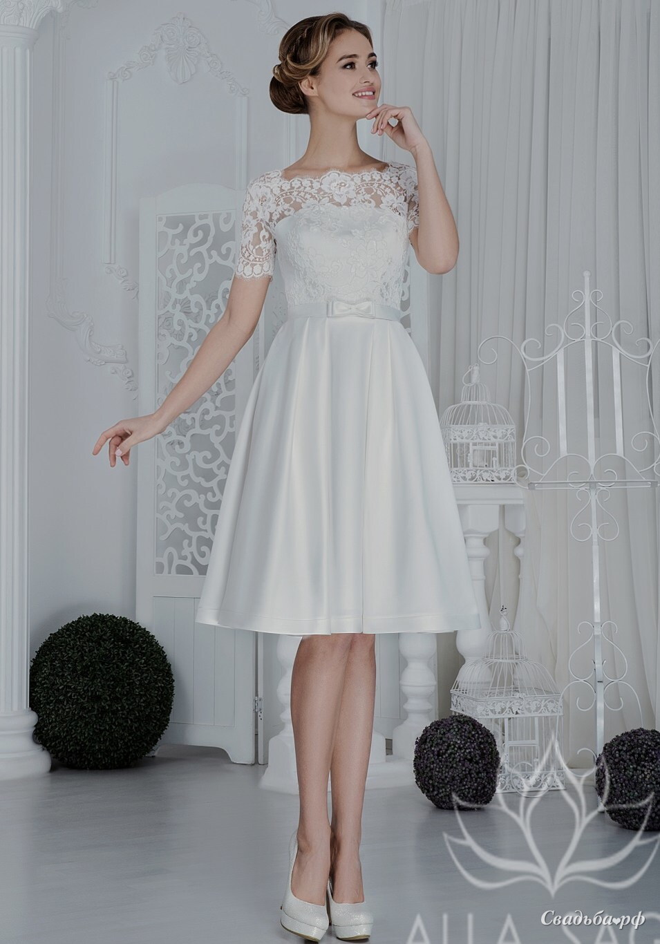 Короткое свадебное платье с пышной юбкой и кружевными рукавами