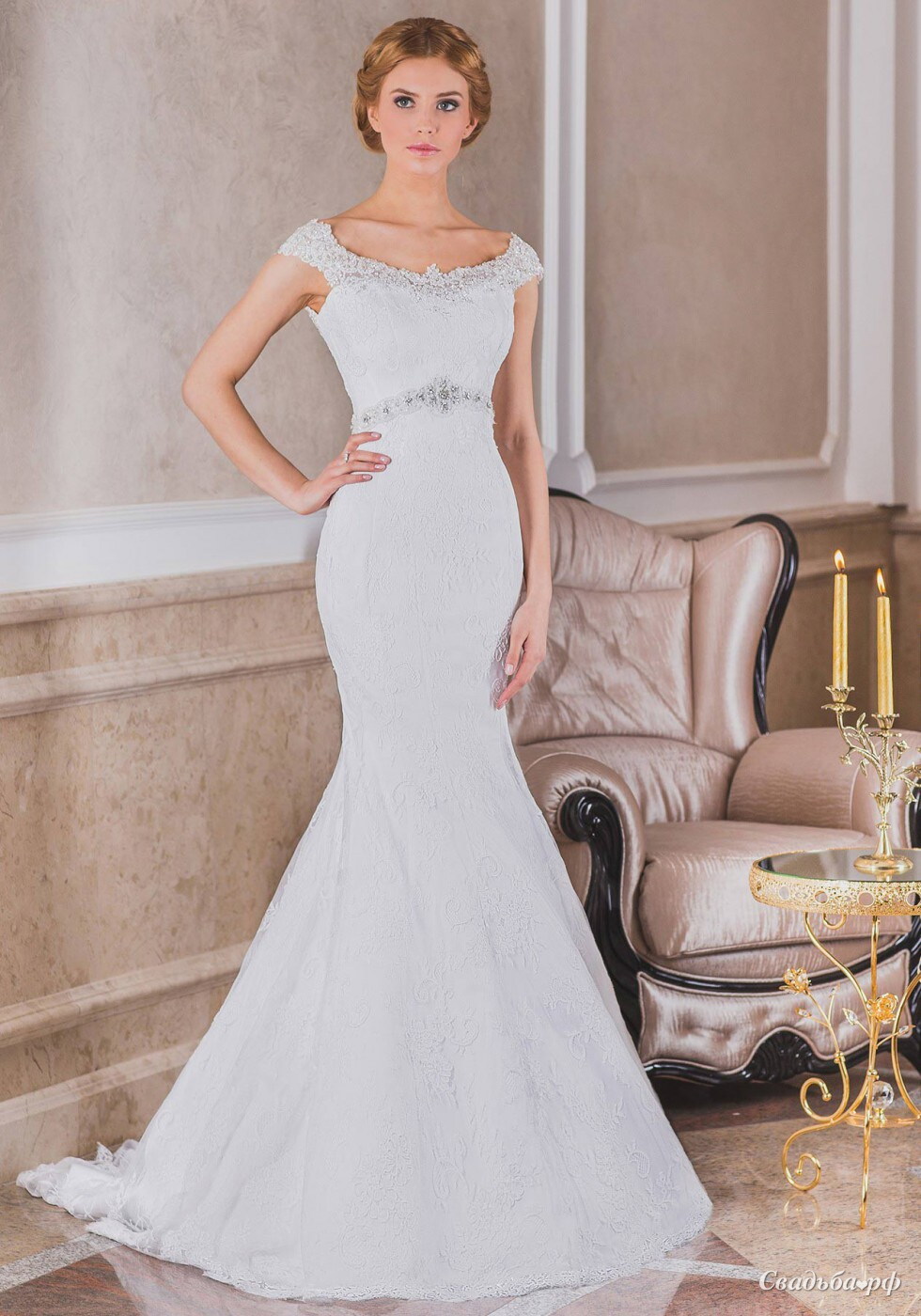 Элегантное кружевное платье силуэта Русалка. Изюминка платья - кружевной вырез лодочка, который закрывает плечи.
