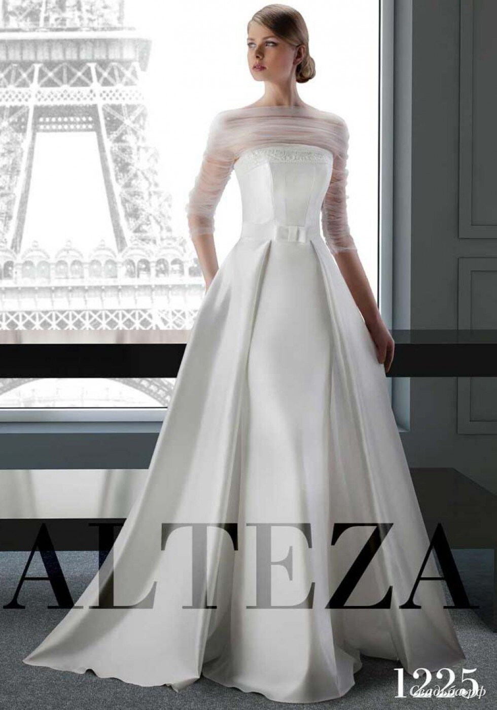 Оригинальное платье-трансформер. В основе платье прямого силуэта с закрытым вырезом корсета. Юбка с фалдами и шлейфом надевается отдельно.