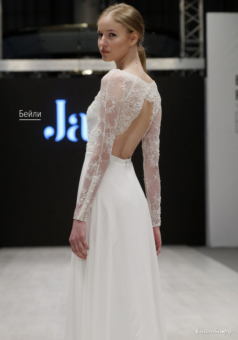 Элегантное платье с длинными кружевными рукавами. Изюминка платья - открытая спина