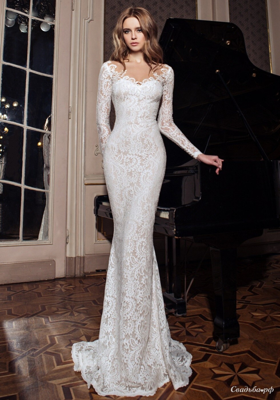 Облегающее кружевное платье с длинными рукавами и небольшим шлейфом.