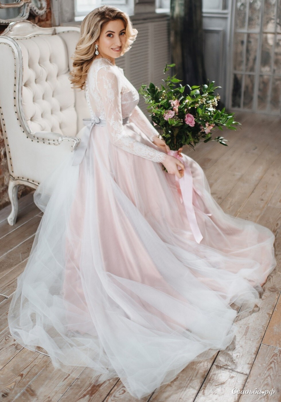 Классическое платье А-силуэта нежно-розового цвета с кружевным корсетом и длинными рукавами.