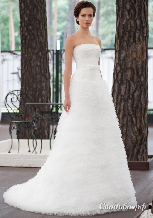 Paganini: классическое свадебное платье в дизайнерском исполнении. Необычная, «пушистая» фатиновая юбка стильно сочетается с удлиненным плотным льняным корсетом. Струящийся шлейф правильной длины не будет мешать при движении.
