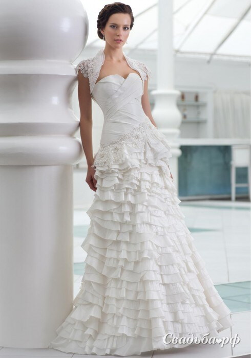 Patricia: это платье - одна из вариаций модели платья Paris, которая наглядно демонстрирует как детали платья могут менять образ в целом. Кружевной пояс и накидка, расшитая некрупными жемчужинами, добавляют в образ торжественности и царственности. Идеальное украшение для свадебного платья!