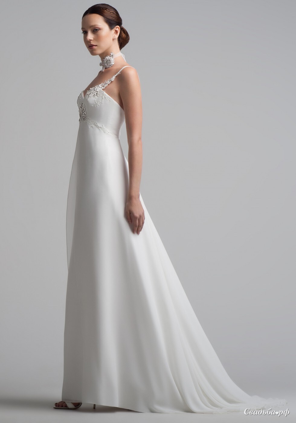 Нежное шифоновое свадебное платье в греческом стиле с кружевным декором - абсолютно цветочный образ, воздушный и трогательный. Платье идеально подчеркивает все достоинства фигуры невесты и аккуратно корректирует некие ее особенности. Ткани и материалы: шифон, кружево. Цвет платья: молочный, кремовый. Идея: цветочный мотив можно продолжить в аксессуарах и украшениях.
