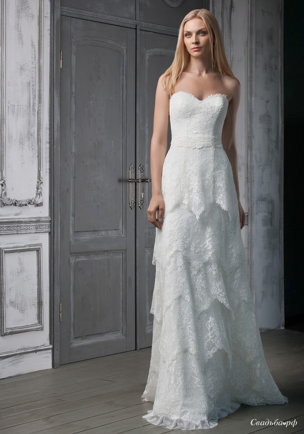 Изящное платье, выполненное в несколько слоев тончайшего кружева в сочетании с плотным корсетом и идеальной линией декольте. Исключительно нежное платье для романтичной невесты!