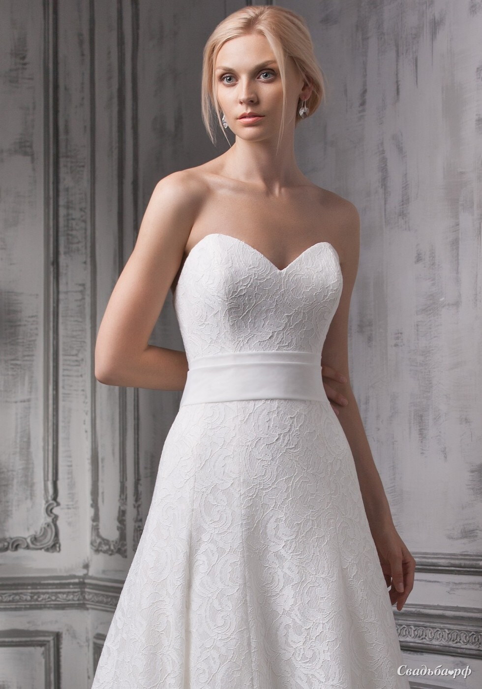 Идеальное белое платье в классическом стиле. Плавное, женственное, изящное и трогательно-торжественное. Оно поможет создать очаровательный образ для венчания или современной свадебной церемонии. Легкое кружево, умеренно подчеркнутый силуэт и широкий матовый пояс с акцентом на талии создают элегантный наряд для стильных невест.