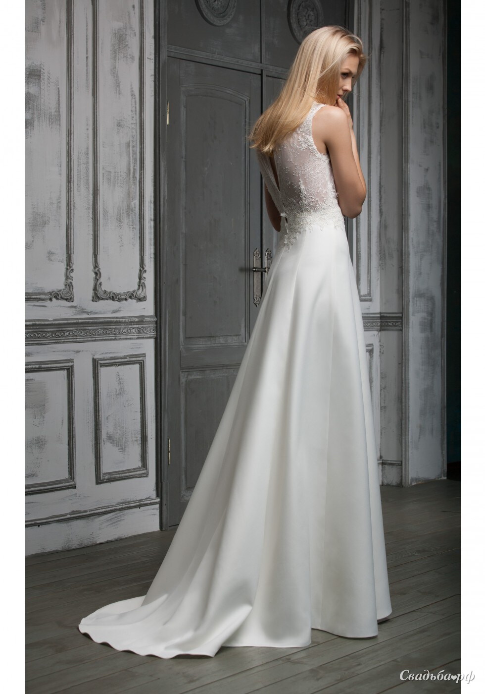 Загадочное платье из легкого крепа и тонкого кружева шантильи. Сочетание хрупких материалов делает невесту нежной и таинственной. Элегантный V-образный вырез подчеркивает женственные линии фигуры. Легкий струящийся силуэт платья изящно обрамлен кружевной окантовкой на талии.