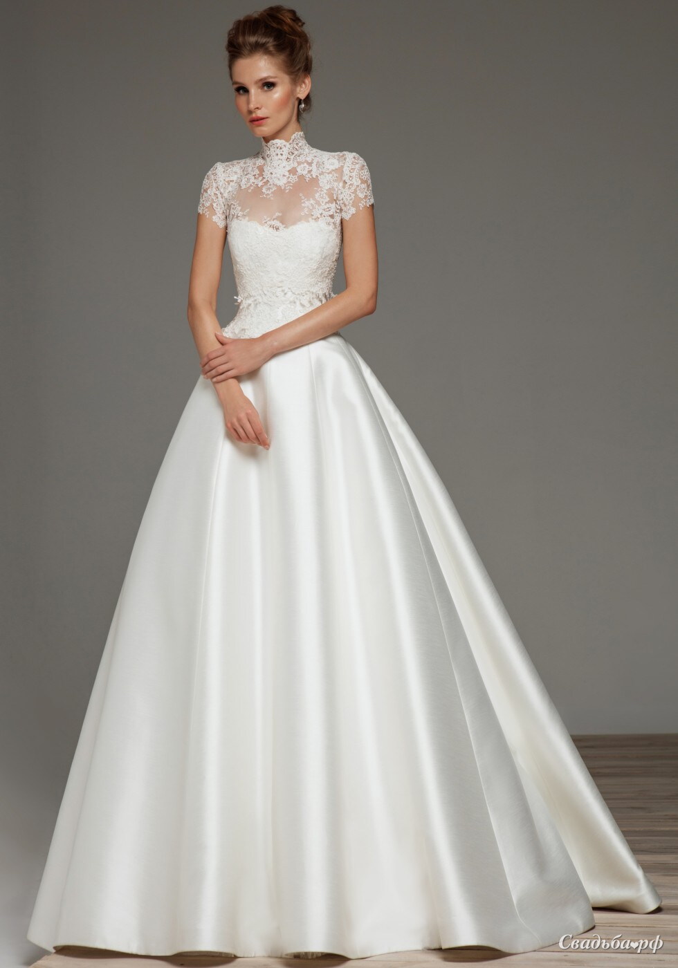 Роскошное церемониальное платье с пышной юбкой, плавной линией декольте и невероятно красивым кружевным топом. Кружевной верх платья выполнен из изысканного кружева с кордовой нитью – все элементы узора выполнены вручную. Гладкая и пышная юбка платья сделана из сатина, известного своим благородным, «закрытым» блеском. Платье прекрасно моделирует фигуру за счет плотного, но мягкого корсета, в котором комфортно будет провести весь свадебный день.
