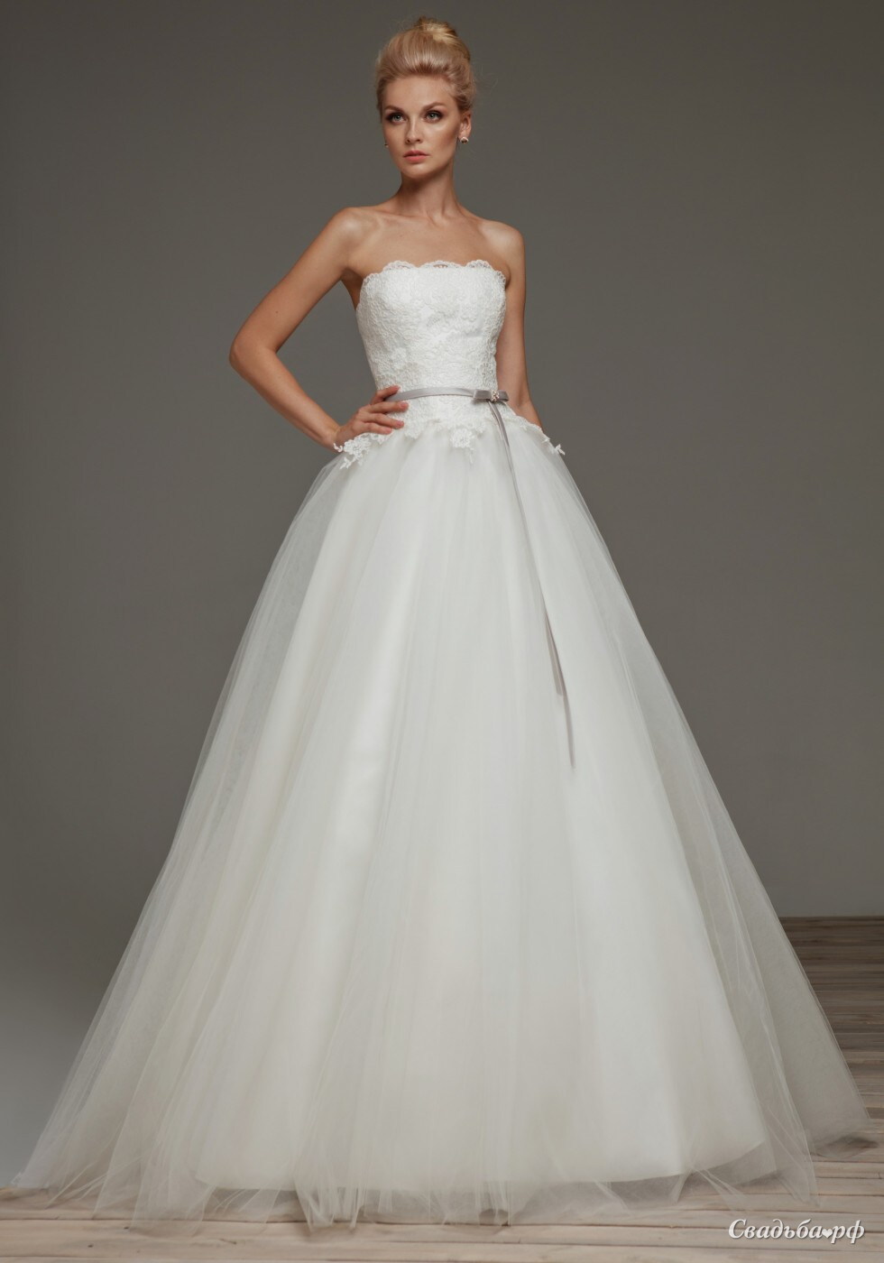 Идея: это настоящее платье современной принцессы! Осталось добавить изящные аксессуары – длинные серьги, колье и завершить образ длинной пышной фатой с кружевом.