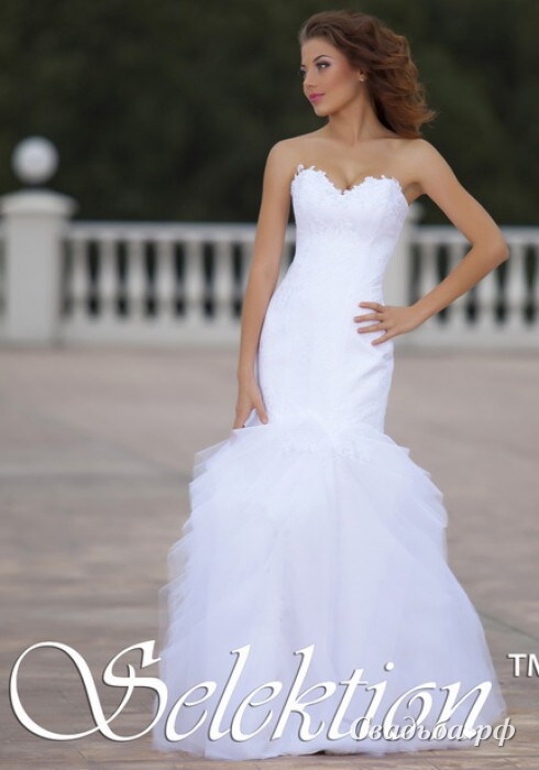 Облегающее свадебное платье с открытой зоной декольте и пикантным вырезом-сердечком на корсете красиво подчеркивает фигуру и придает образу невесты нежности и романтичности. От середины бедра начинается пышная юбка из невесомой ткани. Наряд зрительно вытягивает силуэт и привлекает внимание к бюсту. Отличный выбор элегантной красавицы!