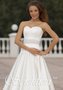 Простое и элегантное свадебное платье с заниженным корсетом и открытой зоной декольте подчеркнёт не только достоинства Вашей фигуры, но и Ваш безупречный вкус. Широкий пояс вручную расшит стразами и бисером. Длинная юбка из атласа расширяется к полу. Изюминкой представленной модели являются обтянутые пуговицы на спине по всей длине корсета.