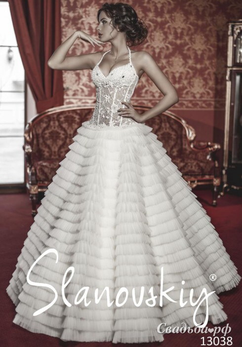 Одновременно роскошное и легкое свадебное платье для дерзкой красавицы. Пышная юбка оригинальной фактуры придаёт образу особый шик. Полупрозрачный корсет с ручной вышивкой и декором из цепочек стекляруса дополнен тонкой бретелью через плечо и пикантным V-образным вырезом. Модель зрительно увеличивает бюст и подчёркивает талию.