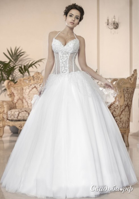 Роскошное свадебное платье А-силуэта придётся по душе самым смелым и креативным невестам. Полупрозрачный корсет с пикантным V-образным вырезом на груди дополнен тонкой бретелькой через шею. Пышная юбка из невесомой ткани придаёт образу лёгкость и романтичность. Модель зрительно увеличивает бюст. На спинке – удобная шнуровка.