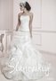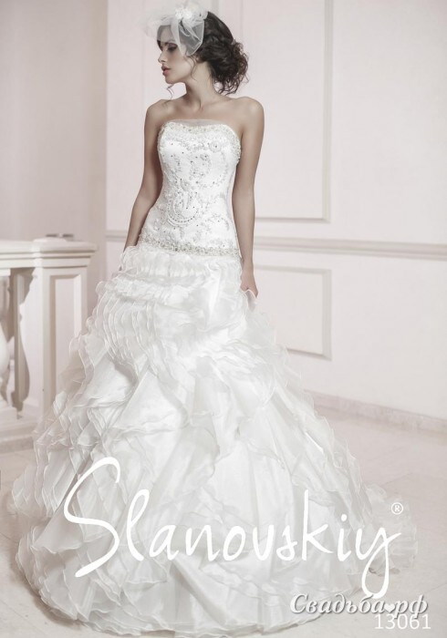 Эффектное свадебное платье с открытой зоной декольте и заниженным корсетом. Верх наряда вручную расшит сверкающими камнями и бисером. Модель выгодно подчёркивает женственные изгибы фигуры. Пышная юбка с вертикальными воланами из лёгкой ткани смотрится очень оригинально и воздушно. Небольшой шлейф придаёт наряду особый шарм.