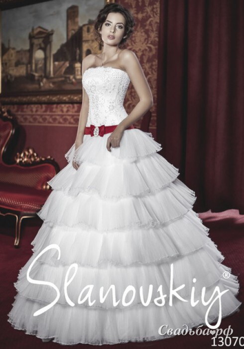 Восхитительное свадебное платье А-силуэта с заниженным корсетом и открытой зоной декольте. Верх наряда украшен сверкающей вышивкой ручной работы. Заниженная талия подчёркнута красным поясом с бантом и брошью. Пышная юбка с многоярусными воланами придаёт наряду романтичность и торжественность. Почувствуйте себя настоящей принцессой.