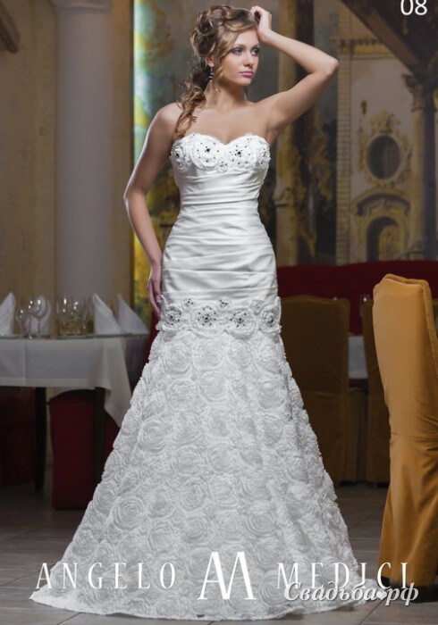 Свадебное платье-трансформер придётся по вкусу самым креативным и практичным модницам. Верх и низ короткого наряда отделан черными стразами. Отстёгивающаяся длинная юбка из нежнейшего кружева кажется воздушной. Лёгкая драпировка и объёмный декор этой модели зрительно увеличивают бюст и выгодно подчёркивают достоинства фигуры.