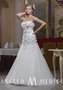 Эффектное свадебное платье с открытой зоной декольте придётся по душе самым романтичным и нежным натурам. Заниженный корсет декорирован объёмными цветами. Наряд зрительно увеличивает бюст и выгодно подчёркивает талию. От уровня бёдер юбка из лёгкого материала начинает расширяться и постепенно переходит в небольшой шлейф.