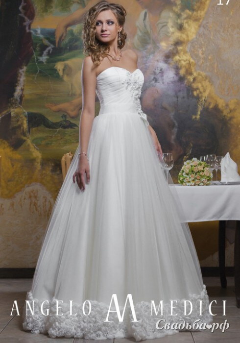 Очаровательное свадебное платье поможет создать нежный образ современной невесты. Короткий корсет с лёгкой драпировкой и соблазнительной зоной декольте украшен объёмными цветами. Струящаяся юбка расширяется к полу. Подол наряда украшен кружевными вставками. Воздушная и лаконичная модель для самых элегантных и романтичных невест.