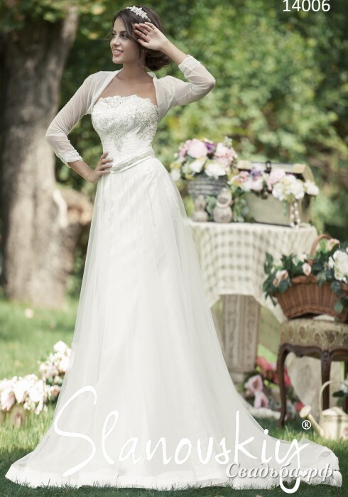 Романтичное свадебное платье с открытой зоной декольте и богато расшитым корсетом создано для нежной натуры. Корсет выгодно подчёркивает талию и зрительно увеличивает бюст. Длинная юбка с полупрозрачным верхним слоем расширяется к полу и переходит в эффектный шлейф. В комплекте с нарядом идёт лёгкая накидка-болеро с рукавами 3/4.