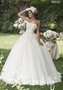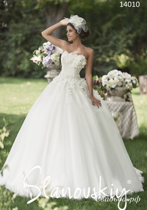 Роскошное свадебное платье с открытой зоной декольте придётся по душе самым романтичным и нежным натурам. Легко драпированный корсет и верх юбки украшены объёмными тканевыми цветами. Наряд зрительно увеличивает бюст и выгодно подчёркивает талию. Пышная юбочка с изящными складками дополнена небольшим шлейфом. Почувствуйте себя королевой!
