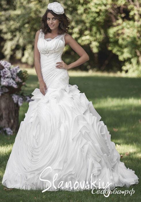 Оригинальное свадебное платье с силуэтом Русалочка создано для самых креативных и дерзких модниц. Зона декольте обрамлена полупрозрачными бретелями. Драпированный корсет со сверкающей вставкой под грудью выгодно подчёркивает женственные изгибы фигуры и привлекает внимание к бюсту. От середины бедра начинается пышная юбка необычной фактуры.