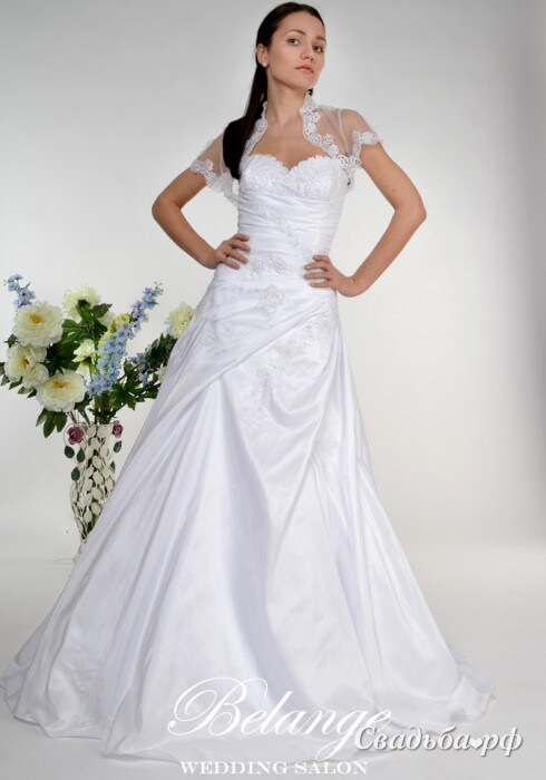 Изысканное свадебное платье Stefani из новой коллекции 2014 года выполнено из матового атласа высочайшего качества. Полупрозрачные рукавчики придают образу нежность и особый шик. Этот наряд А-силуэта по всей длине дополнен эффектной драпировкой. Платье подчёркивает талию и привлекает внимание к бюсту. Длинная юбка расширяется к полу.