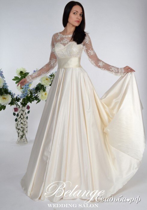 Свадебное платье Juliya из новой коллекции 2014 года выполнено из матового атласа высочайшего качества. Миниатюрный корсет с широким поясом драпирован полупрозрачным кружевом, переходящим на грудь и длинные рукава. Изюминкой платья являются карманы, спрятанные в глубоких складках юбки. Потрясающий наряд для стильной невесты.
