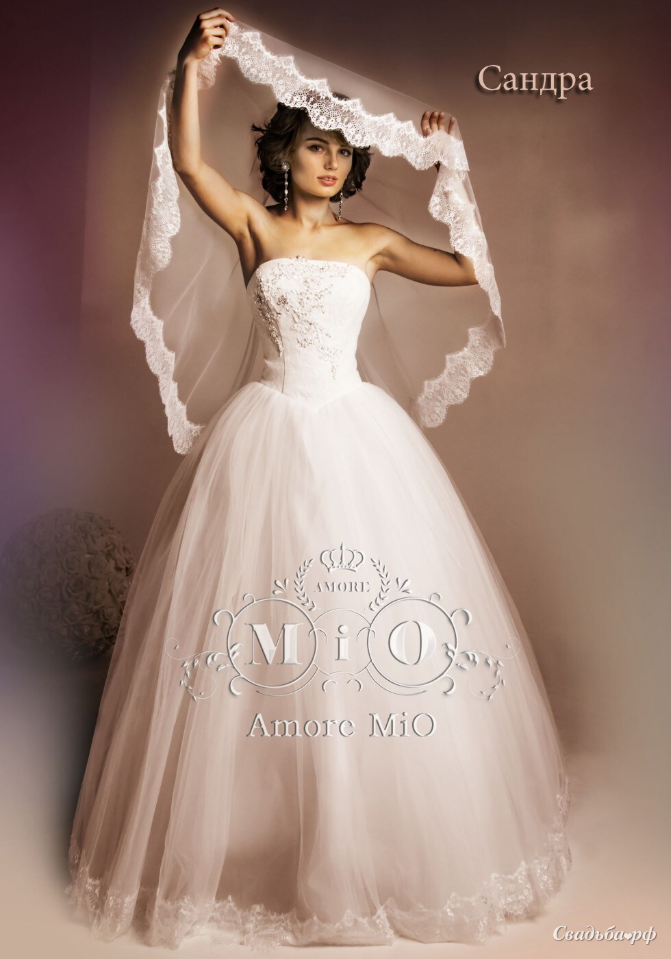Легкое корсетное свадебное платье Сандра с прямым лифом, который декорирован кружевом и кристаллами.