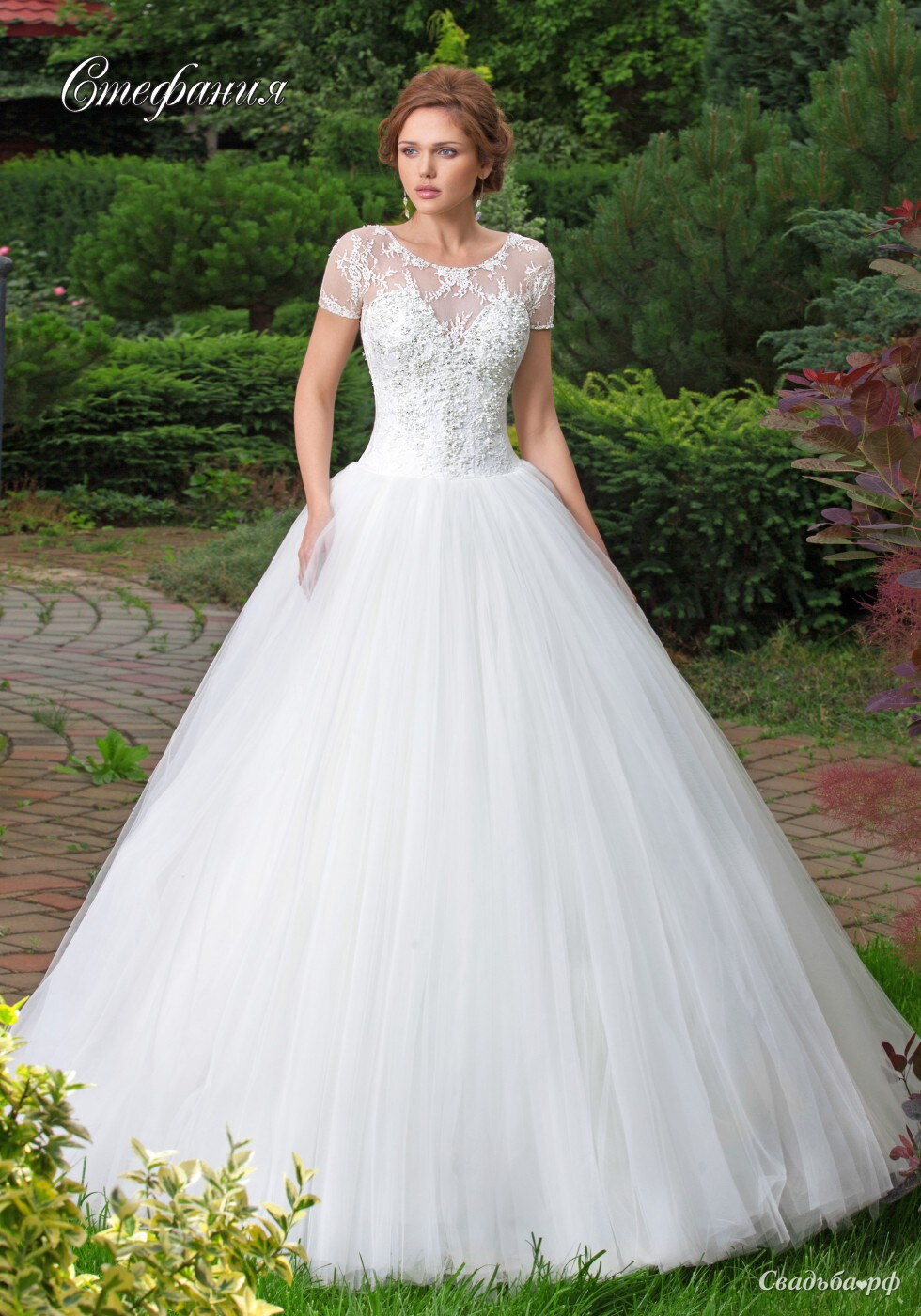 Свадебное платье Lady White коллекция 2016 года, с пышной юбкой и красивым расшитым кружевным верхом.