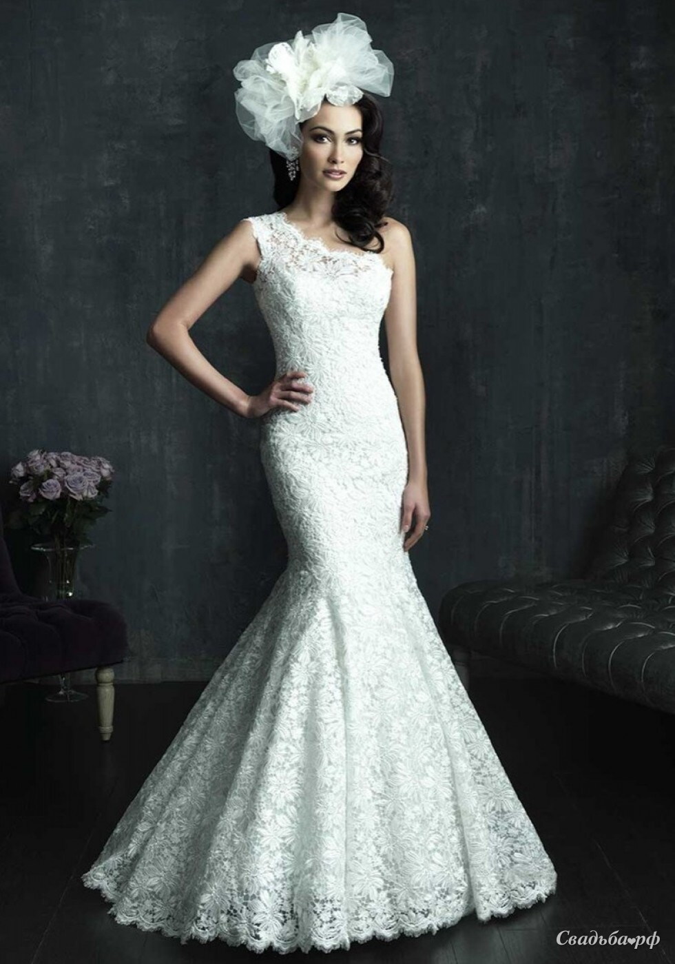 Свадебное платье силуэт-Русалка. Целиком выполнено из кружева. С асимметричной бретелькой.