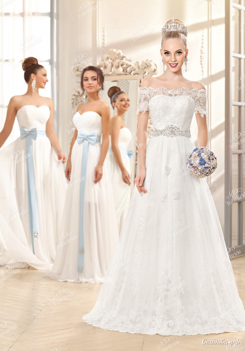 Низкий вырез-лодочка и приспущенные рукава красиво обнажают плечи.