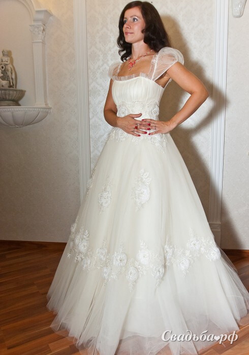 Очаровательное свадебное платье с открытой зоной декольте и рукавчиками-фонариками из тонкой ткани смотрится просто сказочно! Лёгкая драпировка на груди и изящная вышивка на талии выгодно подчёркивают достоинства фигуры. Длинная юбка с ажурными вставками придаёт образу воздушность. Данная модель платья в наличии только 42-44 размера.