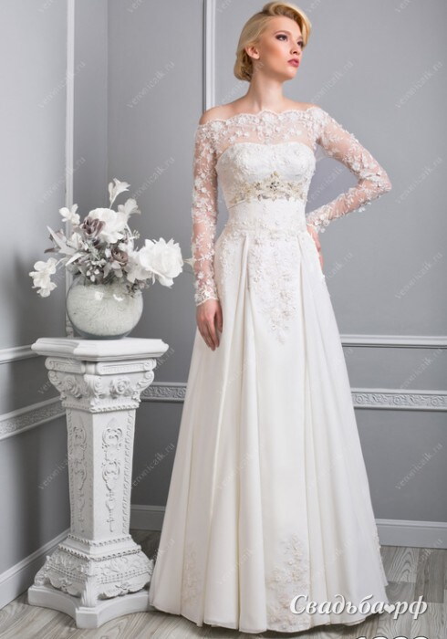Элегантное свадебное платье с приспущенными плечиками приковывает к себе внимание. Кружевная вставка на груди и длинные рукава украшены объёмными цветами. Вышивка под грудью подчёркивает бюст. Длинная юбка со складками слегка расширяется к полу. Подол в нескольких местах дополнен цветочным узором. Данная модель платье в наличии только 44 размера.