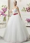 Самым романтичным и стильным красавицам придётся по душе это свадебное платье с красным поясом и цветами ручной работы. Соблазнительная зона декольте приковывает внимание к бюсту. Легко драпированный корсет подчёркивает женственные изгибы фигуры. Пышная юбка по нижнему краю дополнена тончайшим узором контрастного цвета. Платье с фатой на который красная вышивка.