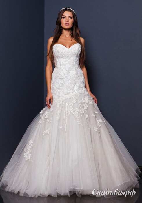 Копия известного бренда CASABLANKA. Изысканные рельефные узоры вышивки полностью покрывают удлинённый корсет с открытым фигурным лифом и спускаются на пышную юбку, состоящую из многочисленных слоёв невесомой сетчатой ткани. Модель выглядит очень элегантно и, в то же время, невероятно романтично.