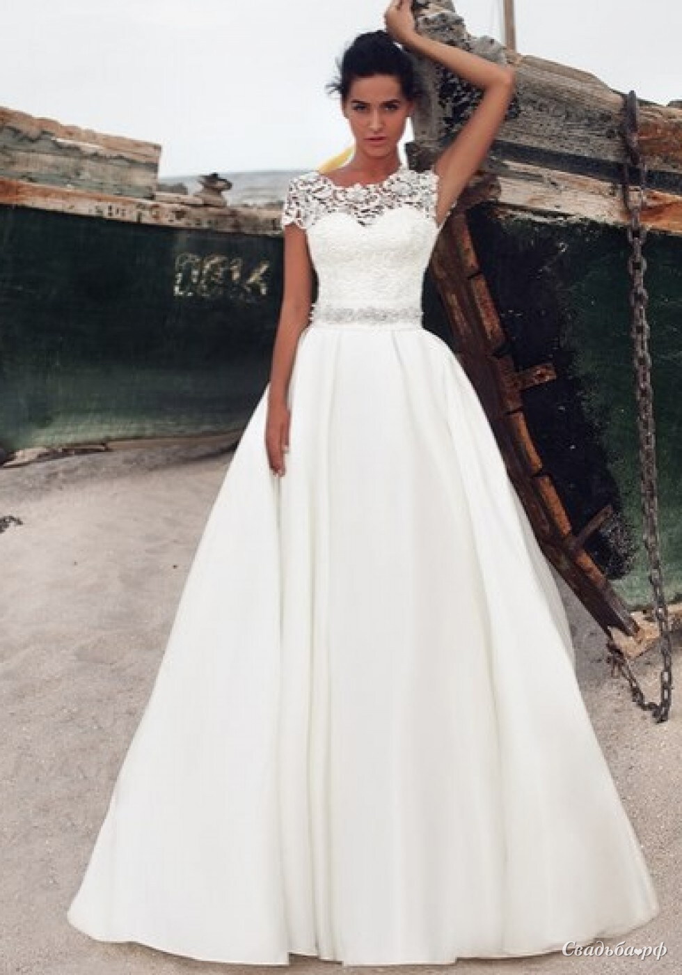 Свадебное платье А-силуэта, юбка из атласа, верх платья выполнен из кружева. (Реплика)