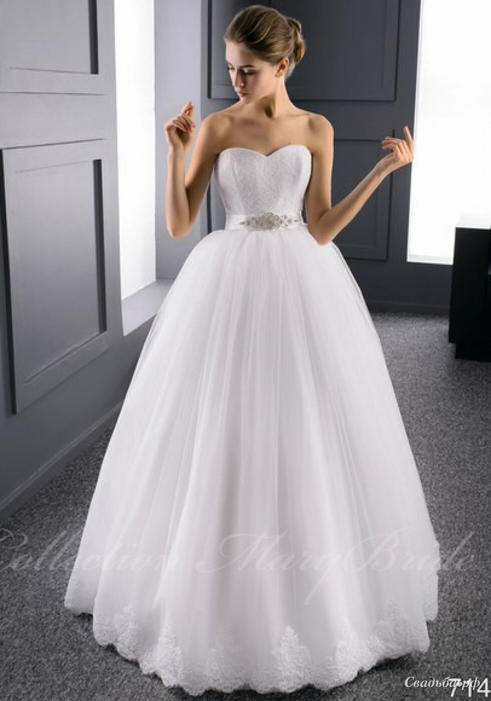 Пышное платье. Строгий корсет с открытым фигурным лифом плотно обтягивает фигуру, эффектно подчёркивая все её женственные изгибы. По всей длине корсет задекорирован тончайшим кружевом с красивыми ажурными узорами. Широкий атласный пояс украшен вышивкой из сверкающих стразов.