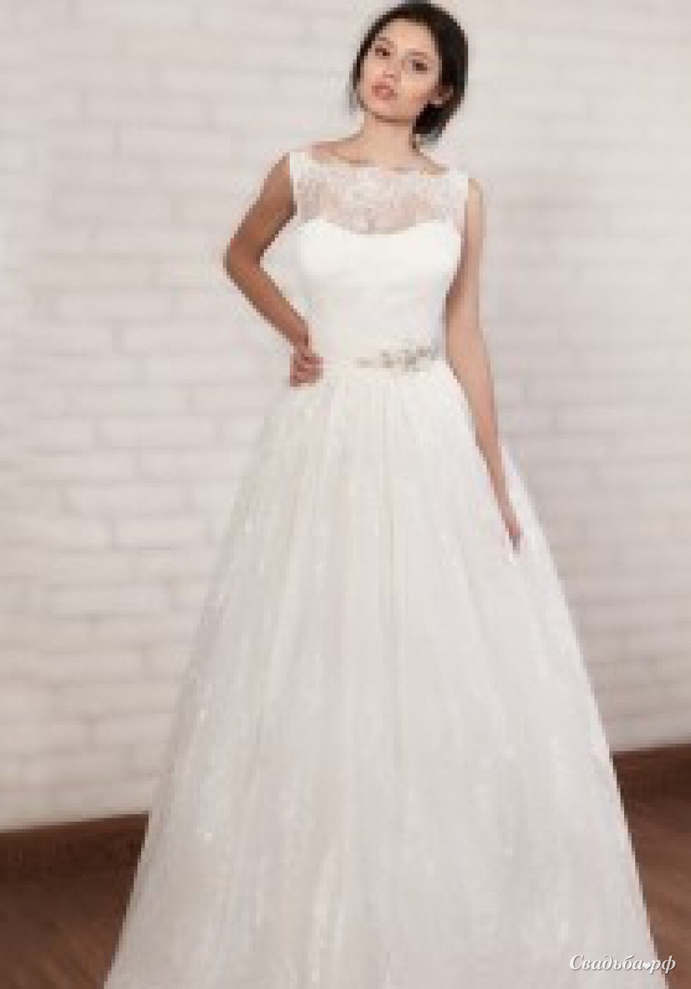 Элегантное свадебное платье с закрытым кружевным верхом поможет создать невинный образ прекрасной невесты. Изящный корсет с расшитым поясом выгодно подчёркивает достоинства фигуры. Пышная юбочка струится до самого пола и придаёт наряду воздушность. В таком очаровательном свадебном платье А-силуэта Вы будете неотразимы!