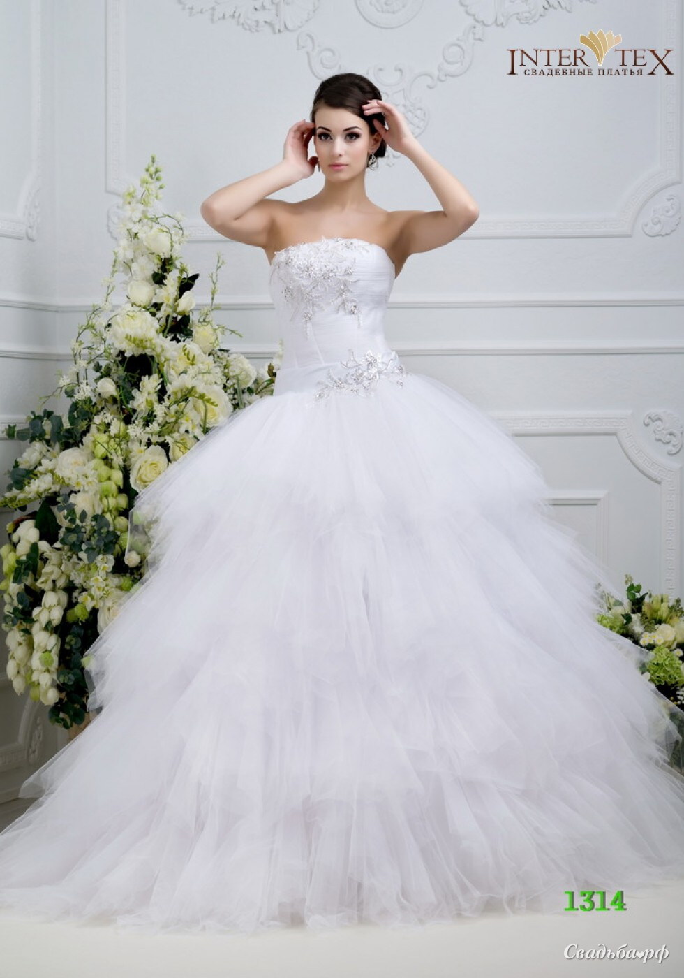 Очень пышное свадебное платье А-силуэта поможет создать сногсшибательный образ современной королевы. Несмотря на пышность, представленное платье очень легкое и удобное. Корсет с соблазнительно оголёнными плечиками и зоной декольте украшен цветами ручной работы. Воздушная юбка с многоярусными воланами оригинальной формы смотрится эффектно.
