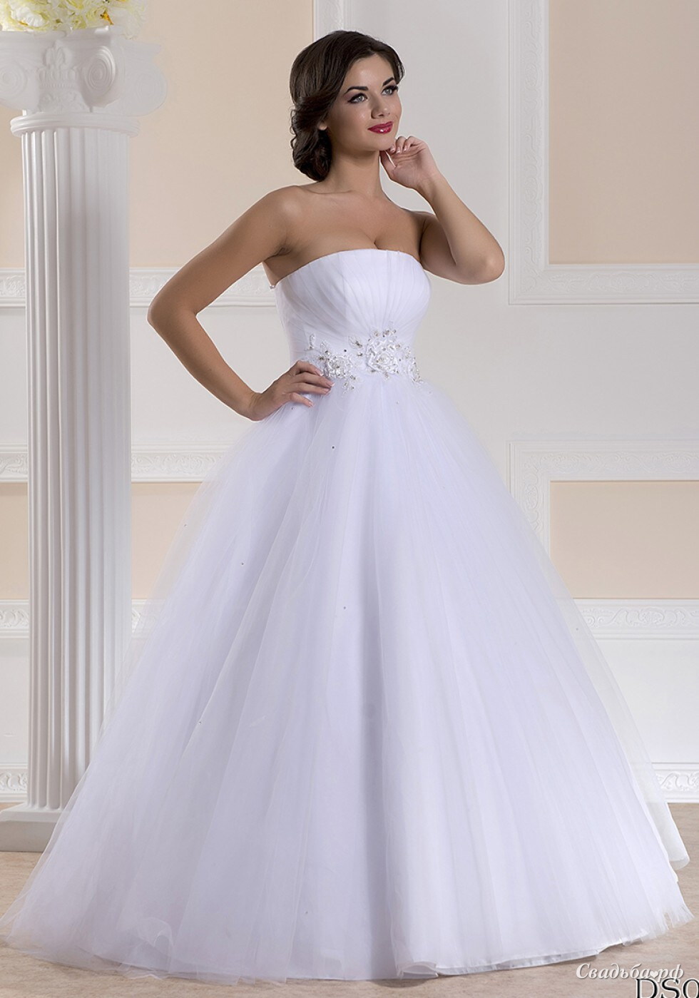 Воздушное свадебное платье из коллекции 2014 года понравится даже самым требовательным модницам. Пышная юбка с мягкими складками придаёт образу воздушность и торжественность. Широкий поясок с цветами и жемчугом снимается. Миниатюрный корсет с тонкой драпировкой и открытой зоной декольте зрительно увеличивает бюст.