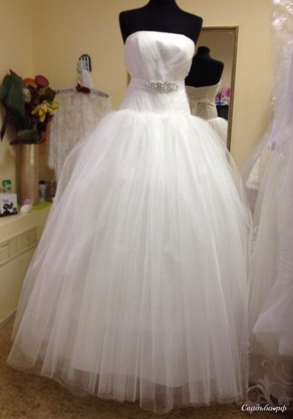 Красивое свадебное платье. Эффектные формы в сочетании с минимализмом декора создают неповторимый образ. Корсет с открытой зоной декольте подчёркивает достоинства фигуры. Пышная юбка напоминает наряд принцессы из волшебных сказок.