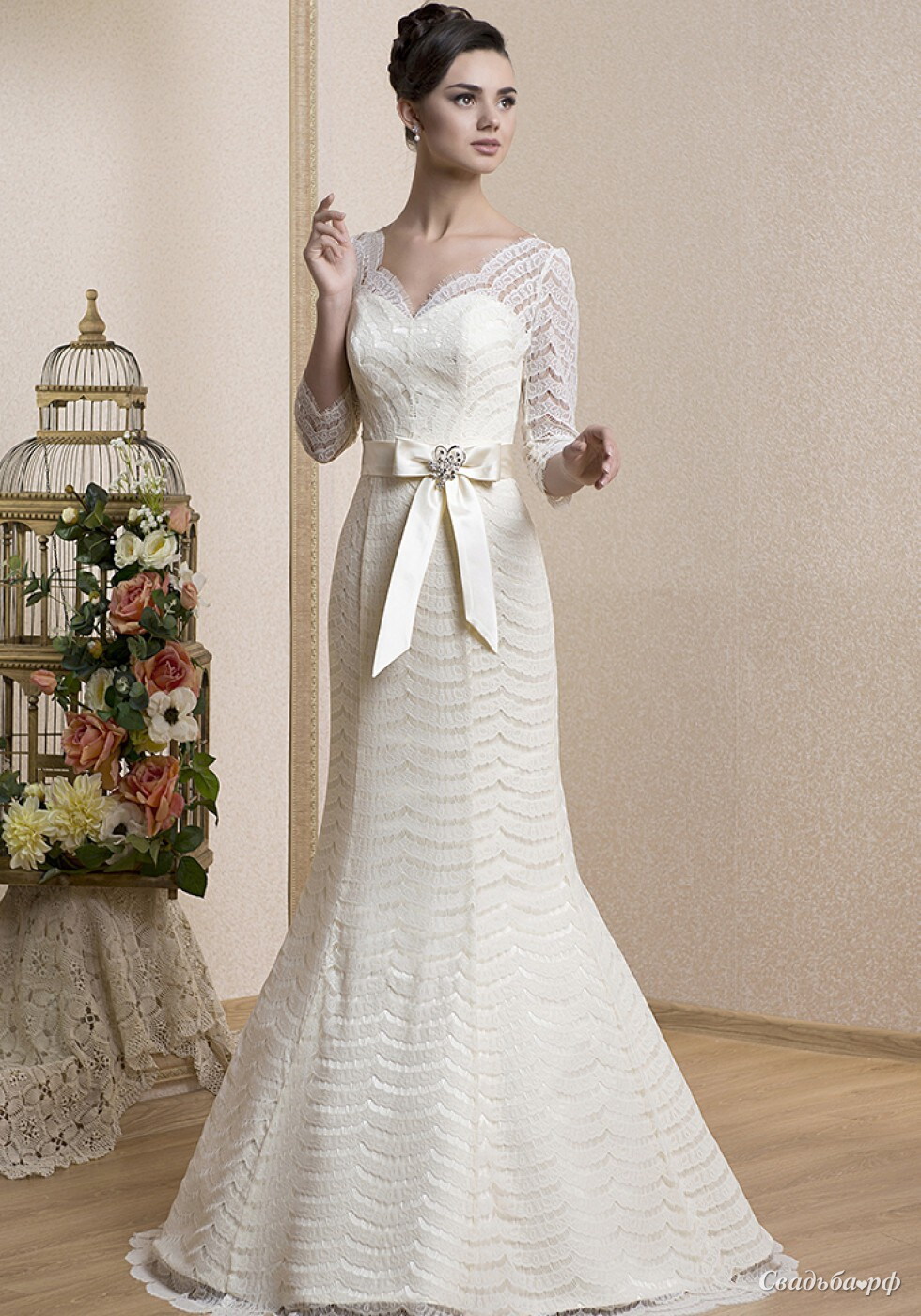 Оригинальное свадебное платье из коллекции 2014 года может похвастаться интересной фактурой и безупречным кроем. Небольшой V-образный вырез на груди в сочетании с длинными рукавами придают образу невинность и изысканность одновременно. Талия подчёркнута широким поясом с бантом и сверкающей вставкой. Длинная юбка расширяется к полу.
