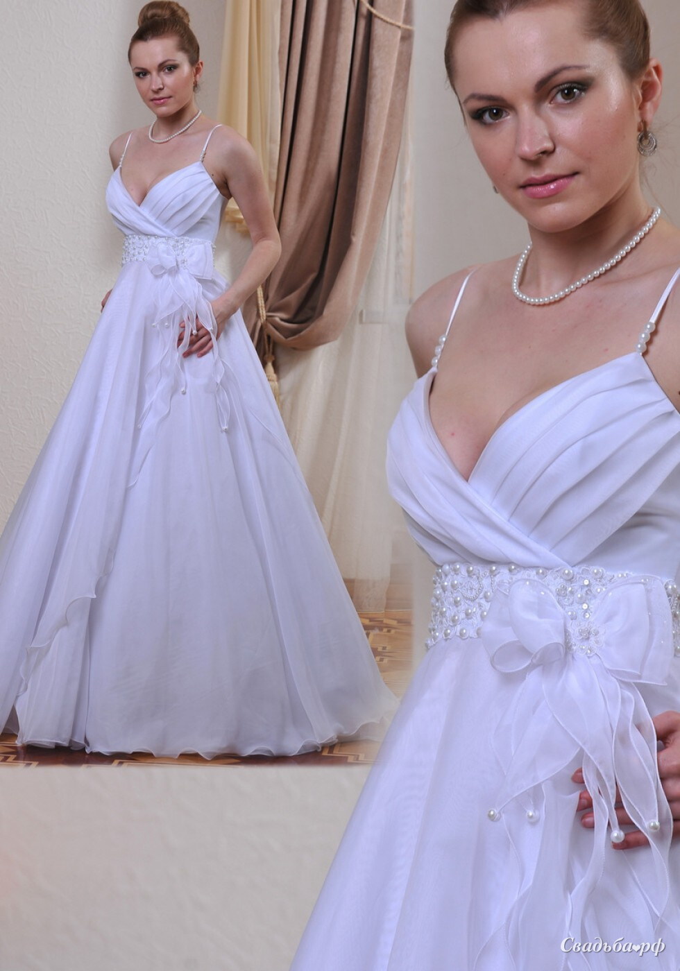Очаровательное свадебное платье с открытой зоной декольте и эффектно драпированным корсетом. Тонкие бретели и роскошный пояс вручную украшены крупными жемчужинами. Роскошный бант на талии придаёт образу романтичность и особый шик. Длинная юбка со складками расширяется к полу. Невероятно женственный наряд для настоящей принцессы.