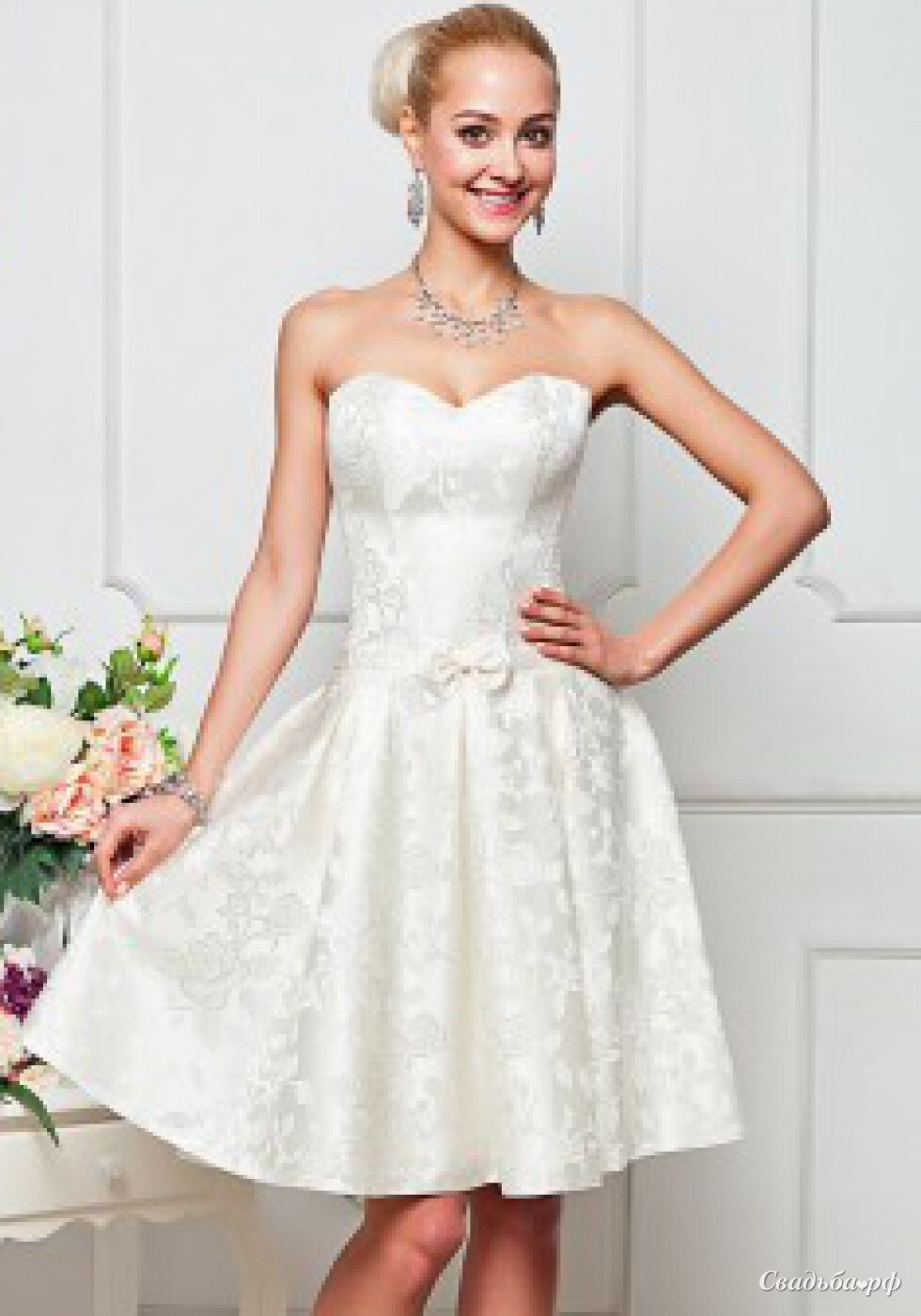 Короткое свадебное платье с плотным корсетом и открытой зоной декольте понравится истинным ценительницам элегантности и простоты. Стильное платье-футляр идеально садится по фигуре и мягко подчёркивает её достоинства. Юбка доходит до середины бедра, благодаря чему Вы сможете щегольнуть своими стройными ножками.