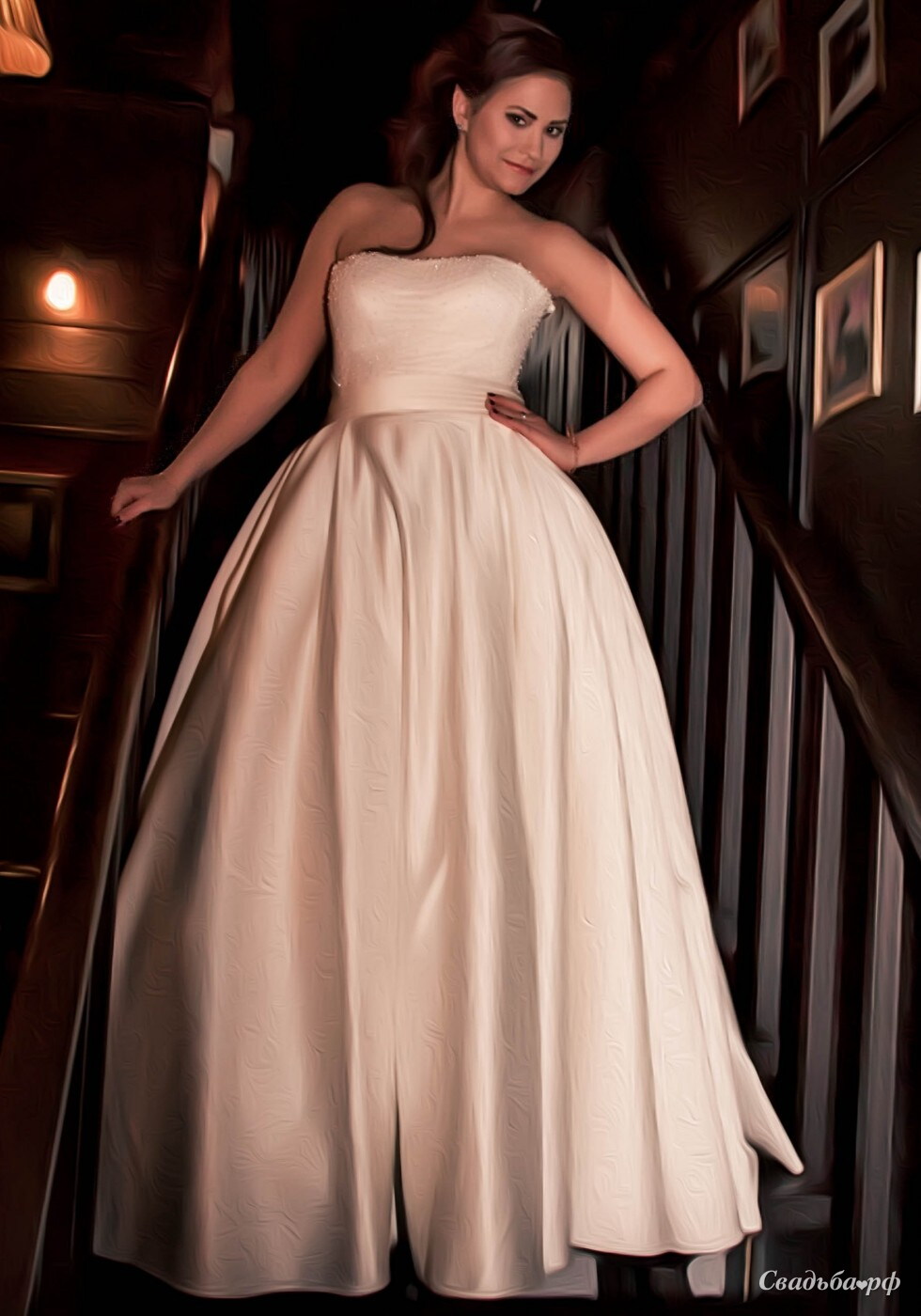 Восхитительный свадебный наряд из плотной атласной ткани, корсет расшит жемчугом.